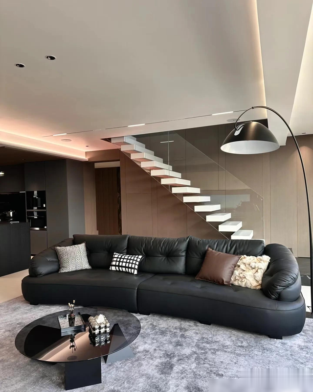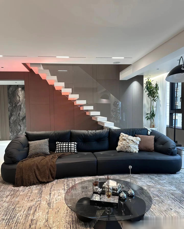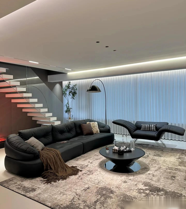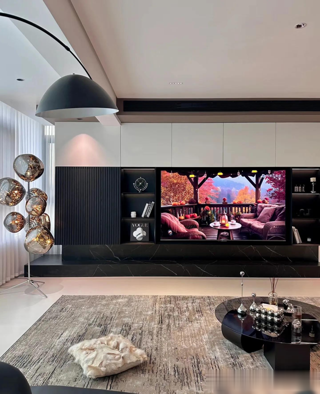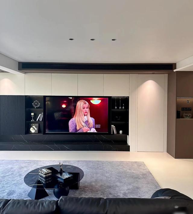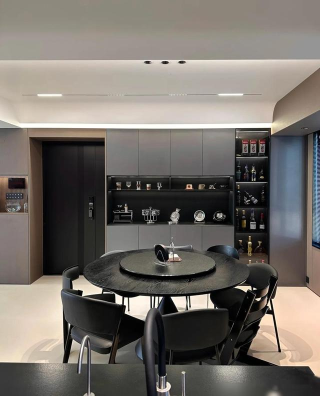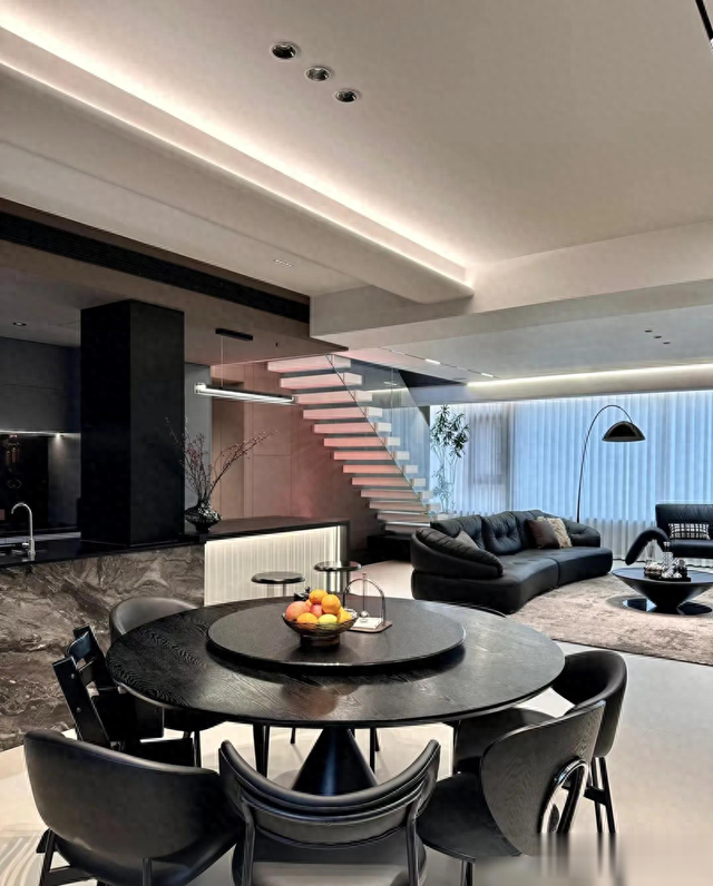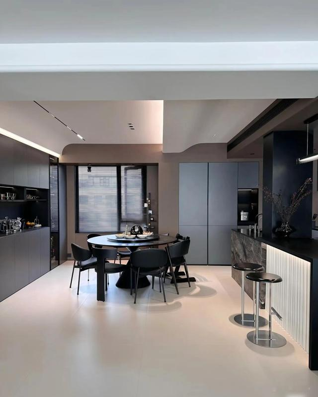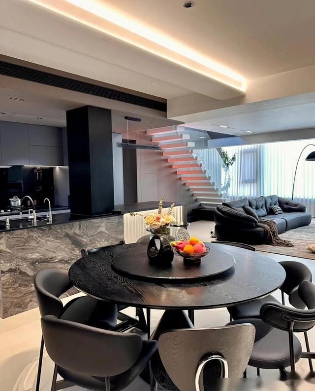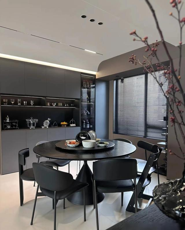 最戳中我的是细节处理,比如瓷砖通铺+同色美缝的“无缝感”,岩板地台内嵌电视的利落,还有圆桌餐厅搭配玻璃展示柜,既通透又有生活气息。顶楼带露台的设计更是加分项,花池和烧烤区把浪漫和烟火气平衡得刚好。说实话,装修能兼顾“显贵”和“耐住”不容易,这家配色和材质选得聪明,深灰、黑、木色经典耐看,十年后也不过时。